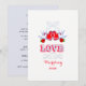 Romantisk, elegant och söt bröllopsdesign med söta röda kärlekshjärtan och rosor med två svalor som knyter en knut. En fantastisk bröllopsinbjudan i älskvärda toner av rött, blått och vitt, dina gäster kommer garanterat att imponeras och tonen är satt för en perfekt bröllopsdag