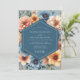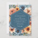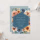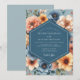 Celebrate your union with this rich, artistic design featuring a lush botanical arrangement. A sophisticated palette of slate blue provides a moody backdrop for vibrant pops of amber, marigold, and warm coral. Painterly anemones and dahlias are rendered in a beautiful, classic style, perfect for an elegant autumn affair.