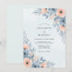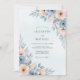 This design features a serene palette of slate blue and soft peach watercolor florals. Delicate roses and airy anemones are nestled among muted dusty blue foliage, creating a romantic atmosphere. Perfect for a seasonal event, the artwork evokes a sense of timeless elegance and natural beauty.