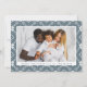 Festivt helgdag-kort med vågräts foto inramat i vitt med en skifferblå och vit nordisk snöflingmönstrad bakgrund. Anpassa det nordiska jullkortet för snöflingor med anpassningsbarna hälsning och familjen namn i ett blått skiffer. Kortet återgår till visning av ditt personliga meddelande.