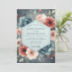 Embrace a dramatic and romantic atmosphere with this stunning artistic design. Lush, painterly bouquets feature peonies and ranunculus in rich slate blue, warm rust, and soft blush tones. Set against a deep, somber background, the floral arrangement creates a beautiful and moody contrast perfect for an elegant affair.