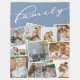 Fotofilt i glattblått med familjen skriven i kalligrafi över toppen. Under, en fotokollage med spridda fyrkantiga bilder som ramas in med vitt.