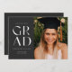 Fira studenten i stil med detta moderna tillkännagivande och inbjudan från studenten. Den har ord GRAD i snyggt sans serif på en färgad i mörken på framsidan, tillsammans med utrymme för ett foto. Baksidan av inbjudan har plats för ett andra foto och utrymme för all information om studentfesten.