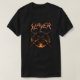 Bring the heat to your wardrobe with this heavy‑metal graphic tee. At the center sits a flaming pentagram sigil formed from scorched, barbed lines and ringed by a distressed circular frame; above it, jagged, lightning‑edged lettering completes the vintage concert‑poster vibe. The design uses a high‑contrast palette of ember orange and charcoal to pop against the black shirt while retaining a weathered, authentic look.