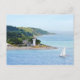 En segelbåt går förbi Sletterhage Lighthouse på östran kusten i Jutland i Danmark. Folk njuter av det soliga vädret när de samlas på stranden.