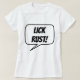 SLICKA RUST! ÄTA GLAS! Grundläggande kvinnogaranti. Dubblan SLICKADE RUST! i tal bubblan framför T-Shirt och EAT GLASS! i tal bubblan på baksidan av T-Shirt.