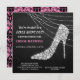 Denna eleganta möhippeinbjudan har en silverfärgad imitation av ädelsten eller diamant på en högklackad sko på en dramatisk svart bakgrund. Bakom skon finns en gnistrande ljustrådad kedja. Din anpassade text är i vitt och rosa till vänster och längst ned. Baksidan av inbjudan har ett gammaldags svart damastmönster övermatchande rosa. En kombination av vintage charm och modern flärd!
