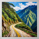 Pittoreska vyer av en smal bergsväg som kurvar graciöst mitt i frodig grön vegetation och branta bergssluttningar under en klarblå himmel med spridda moln.