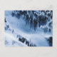 Bilden togs från luft och visar skidåkarna på vägen ner i berget. Träd går i väg nedförsbacken. Dagen var ljus och solig. De här vykorten kan hur som helst användas.