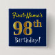 Detta enkelt kvadrerar knäppas designsärdrag ett meddelandenågot liknande"förnamn 98th födelsedag! " med "98th" ha en look för faux-/efterföljdguld-något liknande färgläggning, på en blått färgad bakgrund. Namn kan skräddarsy. Knäppas något liknande som dessa kunde kanske ha på sig av gäster på en födelsedagsfest för någon, som firar deras åttonde födelsedag för nittio, var partyet rymms i ett stort område med raddor annat folk gåva (liksom en stad, parkera eller ett nöjesfält). [~Z0000164]