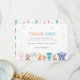 Den här glada tacksamhetskortdesignen visar hela raden av älskade Slumberkins-figurer som står tillsammans längs den nedre kanten och skapar en söt och minnesvärd avslutning på en speciell fest. Den feta rubriken "TACK!" visas i lekfull flerfärgad bokstavsstil, omgiven av spridda pastellfärgade stjärnor som lägger till en festlig glans över den rena vita bakgrunden. Under rubriken lägger ett hjärtligt födelsedagsmeddelande till en varm och personlig touch, med utrymme för en anpassningsbar signatur för att göra det unikt speciellt. Kombinationen av mjuka toner och livfulla karaktärsfärger skapar en balanserad, glädjefull look som koordinerar vackert med en Slumberkins-tematisk födelsedags