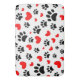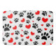Teckning av hund tass avtryck och röda hjärtan i många storlekar.