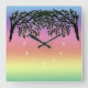 Träd, svart med färgton grönt, från övre hörnen över klockans vita siffror ansikte. Bakgrunden är skugga av rashat i färg genom blå lila, rosa, rött, orange, gult och grönt, uppifrån och upp till grund.