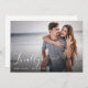 Elegant och modernt spara datum meddelande-kort. Den här designen har ett foto som är överlagt med förlovningen "finally" i ett elegant, ett modernt skript för calligraphy-hjärttecken och datum och plats för bröllop. Lägg även till bröllop-datum längst bak på kortet.