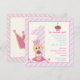 Liten prinsessa och cupcake flickor 1-årsfest rosa blått barn inbjudningar, med en söt liten prinsessa med ljust hår som håller en glasskägge, siffran 1 mönstrad med rosa, himmelsblå diagonala ränder och en cupcake med ett ljus. Det finns en rosa, blå randad kant runt om. På baksidan finns en söt krona. Färgschema: rosa, blått, brunt, persika. Vissa konstnärliga element av Trina Clark.
