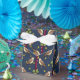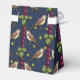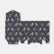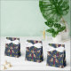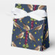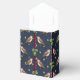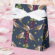 Det charmiga mönstret på denna presentask med band började med en originalillustration av ZoeSPEAK med små sångfåglar. Fåglarna är vända mot varandra, som om de sjunger, mot en djup marinblå bakgrund prydd med små gula stjärnor. Det finns vertikala rader av snurrade röda band, med grupper av gröna blad mellan de små bruna fåglarna.