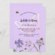 En violett, lavender färgad bakgrund. Dekorerad med bin och målade vilda blommor i violett och rosa och en stor fjäril. Anpassa och lägg till information om namn och party.