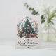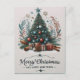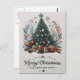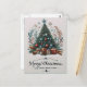 Ett julkort för festtid med ett färgstarkt Julgran med ornament och twinkling ljus, omgivet av vackert förpackat presenter.