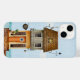 En stor smala och en strutstuckstrutstuga med ett fiskskylt och ett kallt väder är steg bort från ett rent blått hav och himlar med flytande vita moln. Vattenfärgsbakgrunden har perfektens fredliga syn och havsviber.