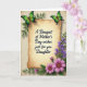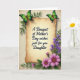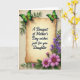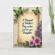Det här kortet är centrerat kring en pergamentpanel med antik ton och mjukt rundade kanter, placerad på en lätt strukturerad krämfärgad bakgrund. Tvärs över mitten av pergamentet står svart, flytande text som lyder ”A Bouquet of Mother’s Day wishes just for you Daughter”, med jämnt fördelade ord som är lätta att se. Två gröna fjärilar vilar nära de övre hörnen, deras vingar skiftar från djupgrönt till ljust limegrönt som om de tillsammans stannat upp i en tyst, tillgivenhetfull ögonblick ❤️. Längs den högra kanten löper en smal, vertikal strimma av små violetta blommor uppåt genom bladrika gröna stjälkar, likt en försiktig vägledning för ögat. I det nedre högra hörnet slår en yvig klunga fuchsia-rosa, prästkragelika blommor ut, med varma bruna mittpunkter som ger en mysig, inbjudande känsla 🌼. Bland