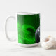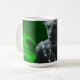 Konstnärlig mugg med gråskaleporträtt av kvinna omgiven av lysande smaragdgrön ljus, symboliserar vitalitet, mystik och kreativ förnyelse