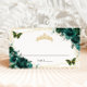 Designad för att samordna med vår Quinceañera Smaragdgröna Blommiga Prinsessa Födelsedag samling, har denna eleganta platskort vattenfärg smaragdgröna blommor, gröna och gyllene fjärilar och en gyllene prinsesskrona. (c) The Happy Cat Studio