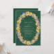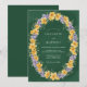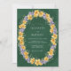 En djup smaragdgrön bakgrund skapar en sofistikerad scen för livfulla gula primula och ömtåliga lavendelblommor. Designen visar upp en frodig kant av botaniska element, inklusive gröna blad och små lila kronblad. Denna organiska färgpalett av skoggrön, guld och violett skapar en fräsch och elegant atmosfär för en säsongsbetonad naturinspirerad tillställning.