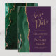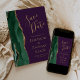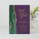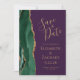 Den vänstra kanten på detta eleganta moderna bröllopskort för att spara datum har en smaragdgrön akvarell-agatgräns med falskt guldglitter. Den anpassningsbara texten kombinerar guldfärgad handskrift, kopparplåt och kursiva teckensnitt på en djupt lila bakgrund. Baksidan har en matchande smaragdgrön och gul agatdesign.