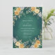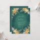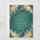 En djup smaragdgrön bakgrund med en mjuk akvarellstruktur skapar ett sofistikerat och stämningsfullt humör. Frodiga gula rosor är parade med ömtåliga vita blommor och eucalyptusblad för en rik botanisk estetik. Perfekt för ett formellt vinter- eller höstevenemang, färgpaletten balanserar djärva juveltoner med varma blommiga accenter.