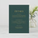 Fullborda din bröllopssvit med vårt Smaragdgröna Monogram Bröllopsdetaljkort. Detta kort presenterar elegant ytterligare bröllopsdetaljer mot en lugn smaragdgrön bakgrund prydd med ett delikat monogram. Ett perfekt tillägg för att informera gäster om specifika bröllopsdetaljer.