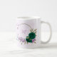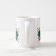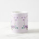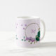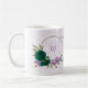 Vacker romantisk kaffekopp med smaragdgröna och lila blommor och några blad .