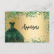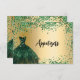 En falsk guldliknande bakgrund dekorerad med en grön klänning och konfetti. Matbordskort