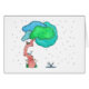 Tvättfåglar tar skydd från en regndusch under träden medan man spelar i en pöl. Vattenfärg och Bläck. Roligt kort för en regn dag!