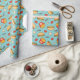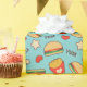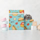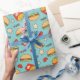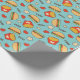 Gulligt slående in papper i blått med ett mönster av cheeseburgers och småfiskar.