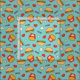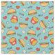 Förtjusande blåtttyg med cheeseburgers, småfiskar, hjärtor och stjärnor. Yum!