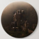 Rundafotoklistermärken med det medeltida småstadEltz slottet som byggas på en backe som omges av skogar med träd i höstfärger i morgondimman på soluppgången som skapar ett spöklikt, avbildar nära den Mosel floden i Tyskland.