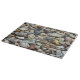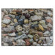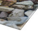 Stäng ett foto av småstarna på en strand som är tryckt på en glashuggbräda.