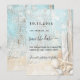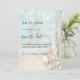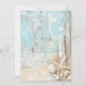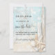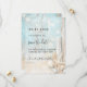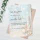 En rustisk bröllopsinbjudan till stranden med drivträ, årskel och sand. Blå och beige färg. Anpassa och lägg till ett datum och din namn. Texten: Spara datumet skrivs med ett stort trendig-handskript i stil.