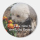 The design depicts a peaceful, free, happy and loving bichon taking time to smell the flowers