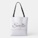 A cheerful and stylish tote bag featuring elegant script lettering with delicate heart accents, perfect for women who love positive, uplifting, and aesthetic everyday accessories. The clean, modern design makes this tote ideal for shopping trips, errands, work, school, or weekend outings. Its warm “Smile” message adds a gentle touch of joy and encouragement, making it a beautiful accessory she’ll love carrying everywhere.