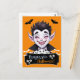 Halloween-vykortet har en leende vampyr som visar upp sina fanger, med fladdermus som flyger runt.