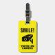 Smilt att du är med i kameran, roliga resväskor. Roligtens etikettutformning för resväskor och påsar. Cute bagage - tillkommande presentidé för flygande manar, kvinnor och barn. färg för ljusa gulter eller anpassaden. Humoriserat citat med säkerhetskamera.