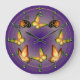 En söt fjäril dekorerade klockan med orange och grönt, brun/guld och orange- och svart fjärilar på graderad lila och gult bakgrund. Slussdetaljer finns i en metallisk grönt med guld högdagrar och två guld ringar.