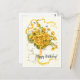 Vintage födelsedagskort med livfulla gula blommor på en dekorativ blommig bakgrund.