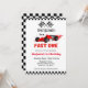 På födelsedagsinbjudan finns en röd för barn och frasen "fast en". Denna beundransvärda första födelsedagsfest har ett biltema i tävling och har ord som "fast ett" och en bild av ett rött vintage bil.