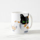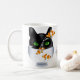 Svart katt med Grönt öga som tittar på fiskskålen och hoppar på guldfisk för sitt nästa kattunge-snack. Cat Lovers-presenter - för roligt
