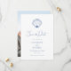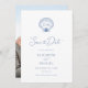 Det här kustblå strandbröllopet, spara datumkortet har en snäcka med det monogram initialer av bruden och brudgummen och en fotomall på baksidan.