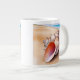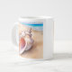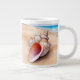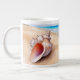 Giant Mugg i en vattenfärgsdesign av en stor konisk snäcka som vilar på en solbelyst strand. Mjuka pastelltoner och milda detaljer ge är ett drömt och avslappnat intryck. Havets turkosa blues och fluffa moln i bakgrunden bidrar till den fredliga, tropiska känslan.