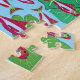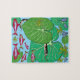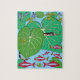 Ett pussel med ett unikt Snake@Green löv . En stor grönt löv gömmer bakom den en orm med svarta fläckar och ett rött tunga. Grodor i olika gröntar med liten grönt löv. Röda fiskar och munkar.färg i tryckningen innehåller grönt, grått, rött, en blå nyans som perfekt kompletterar färg i pusslet.