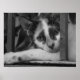 Ett svartvitt fotografi av en kattunge som ber om din uppmärksamhet.